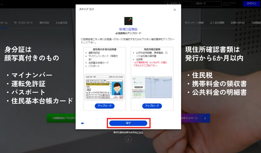 - 現住所確認書類(6ヶ月以内に発行):公共料金の請求書・住民票の写し・銀行の取引明細書